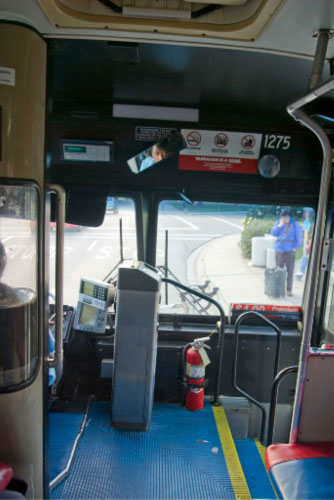 - Bus Interior: pay station in the bus - forces users to stand while paying, must have exact change, bus needs to wait while user pays, or user must try to balance as the bus moves forward, bus driver announcements are often unheard due to background noise or cellphone use