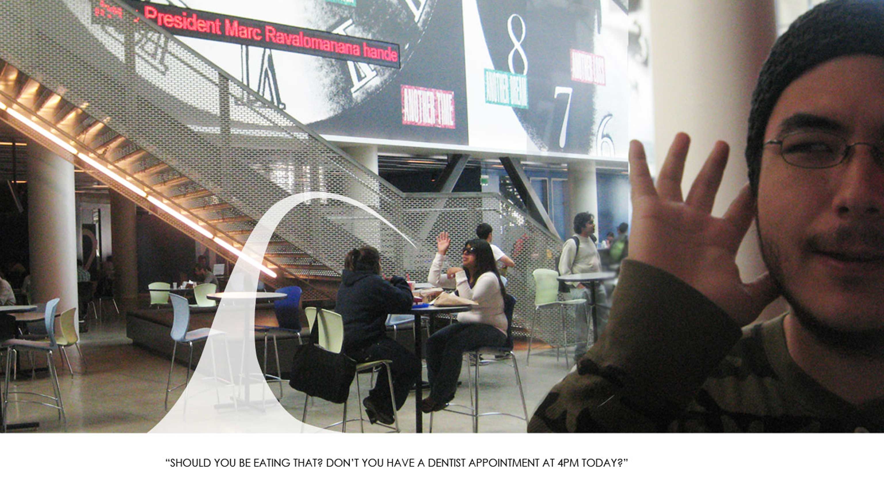 Most of us have experienced the “Cocktail Party Effect”: an auditory ability which allows us to pay attention to one voice or conversation among the many that are happening at the same time. However many of us have also experienced hearing one’s named called in a noisy environment only to look around and realize that it was merely one’s imagination. Auditory hallucinations are common whether it’s hearing the sound of a siren instead of the school bell or somebody’s ringtone sounding like your cell phone. Inner Voice takes advantage of these two phenomena of the auditory system as a way to convey data pertaining to one’s personal schedule.